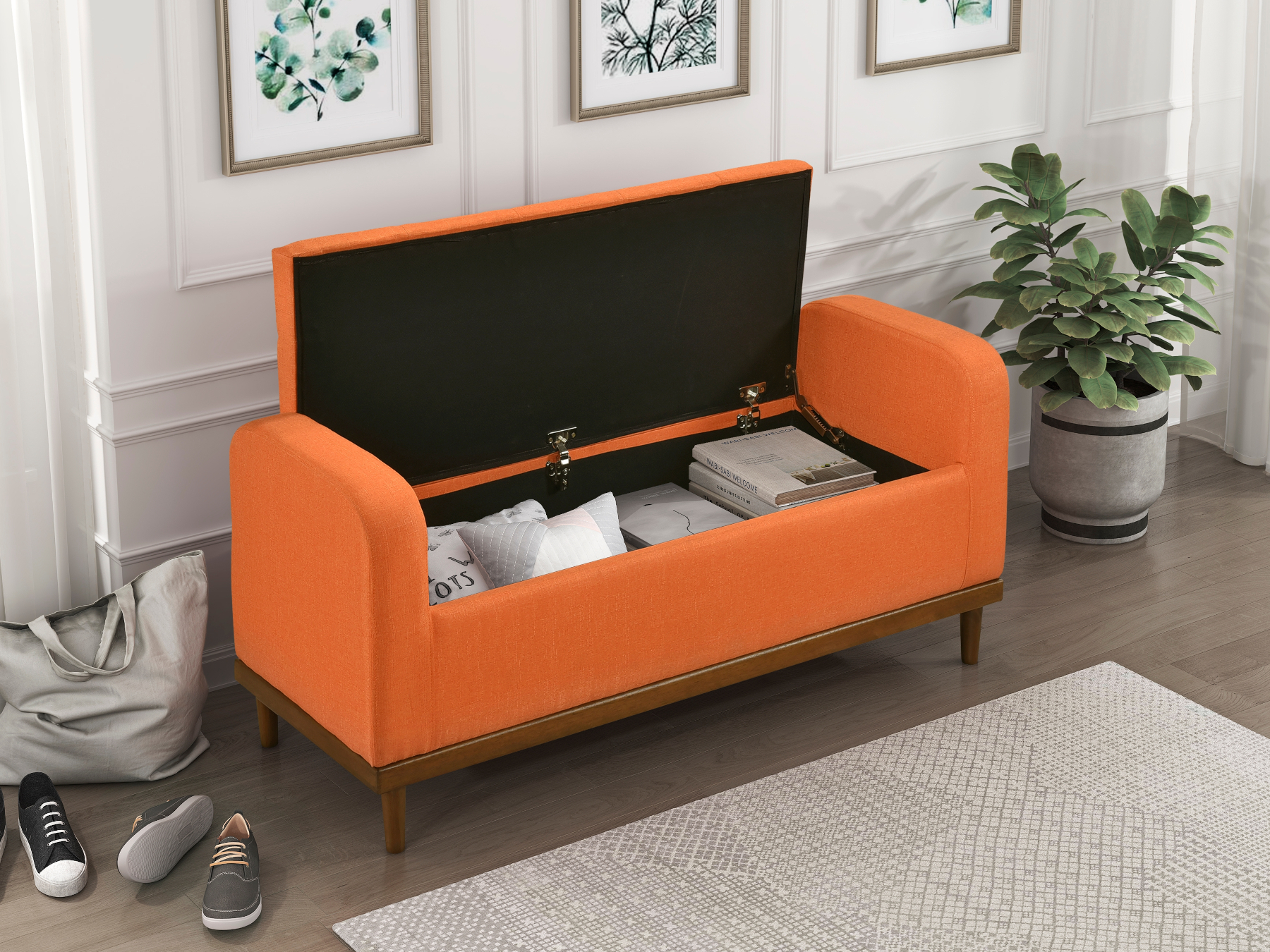 Home / Shop / Furniture / Livingroom / Accent Chairs, Accessories & Bar Stools / Storage Bench Storage BenchStorage Bench:$399.95 Orange in Colour Also Available in Brown and Grey Storage Bench quantity Add to cart Description Description MF-4590 26799 – Storage Bench, Orange Dimensions Length: 50″ Depth: 18.5″ Height: 22.5 Seat Height: 18″