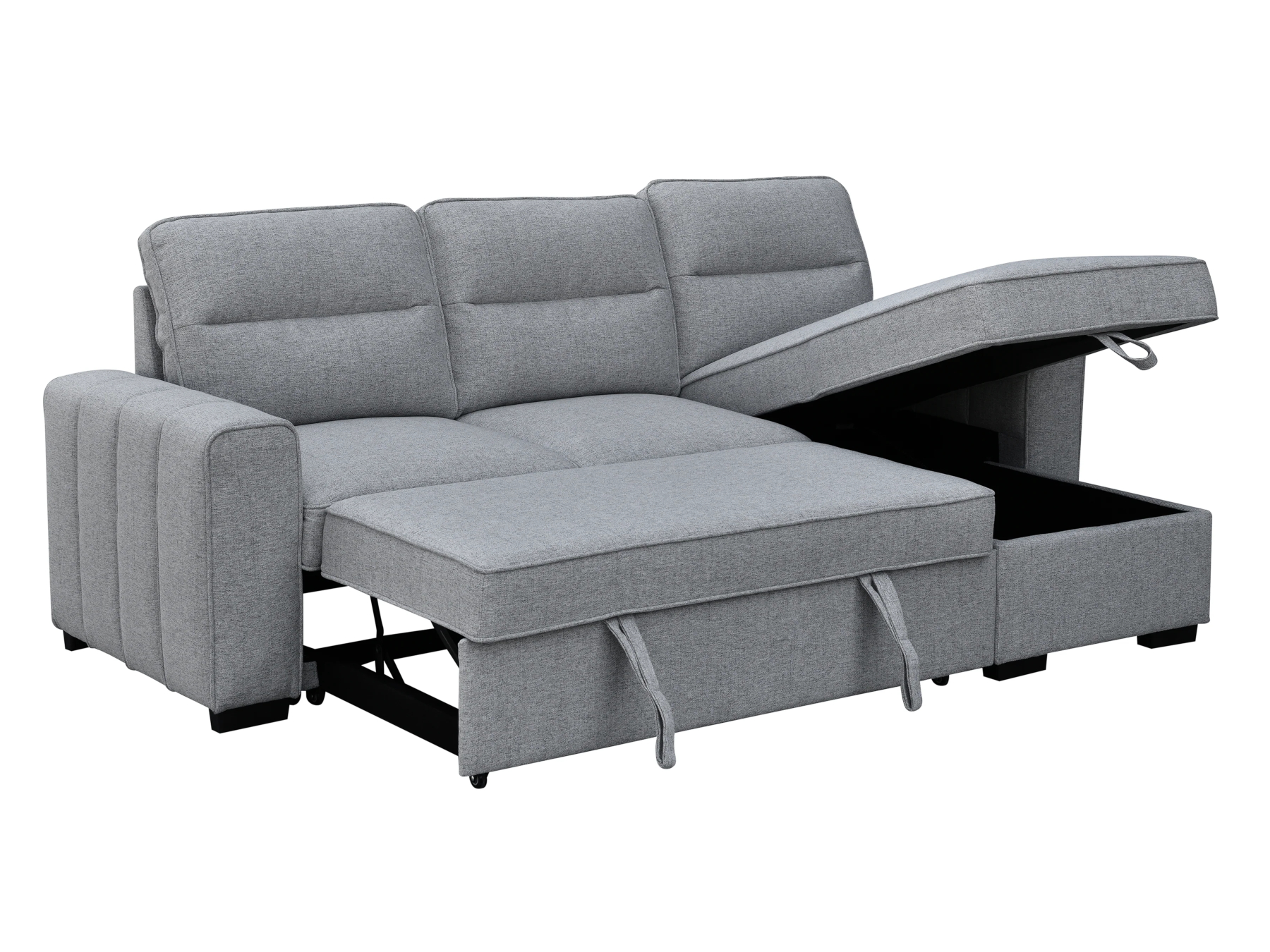 The Delphina sectional is designed for everyday lounging with a touch of hidden versatility. Upholstered in soft grey fabric, it features wide arms and subtle channel tufting along the arms and back cushions for a tailored finish. A pull-out bed transforms the sofa into a guest-ready sleeper in moments, while the chaisse lifts to reveal storage for extra bedding or everyday essentials. Deep foam cushions with pocket and zig-zag springs deliver lasting support, and a solid and engineered wood frame keeps the structure strong. Finished with low-profile legs, Delphina balances comfort, durability, and style in a compact footprint.